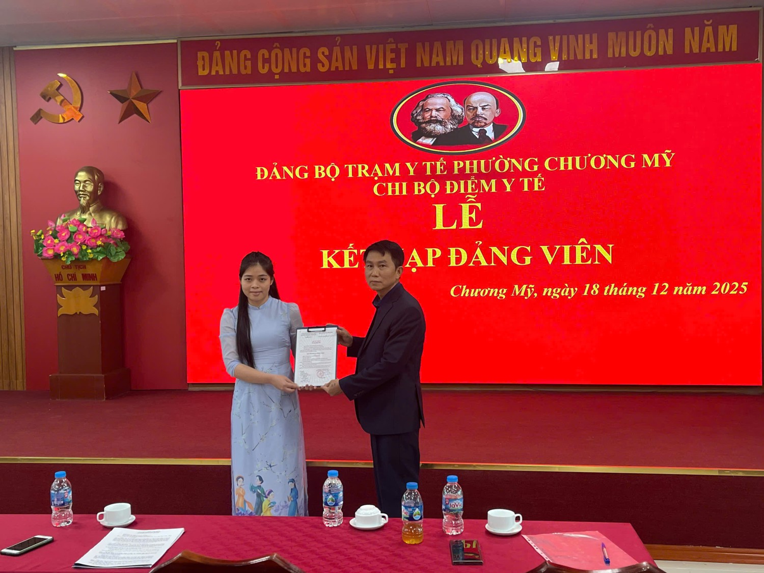 Trong thời gian qua, Chi bộ Điểm Y tế luôn chú trọng công tác tạo nguồn, phát hiện, bồi dưỡng quần chúng ưu tú, gắn việc rèn luyện phẩm chất chính trị, đạo đức lối sống với nâng cao trình độ chuyên môn, tinh thần trách nhiệm và y đức của người cán bộ y tế. Quần chúng được kết nạp Đảng hôm nay là cá nhân tiêu biểu, có lập trường tư tưởng vững vàng, phẩm chất đạo đức tốt, hoàn thành tốt nhiệm vụ được giao, tích cực tham gia các phong trào thi đua và hoạt động của đơn vị.