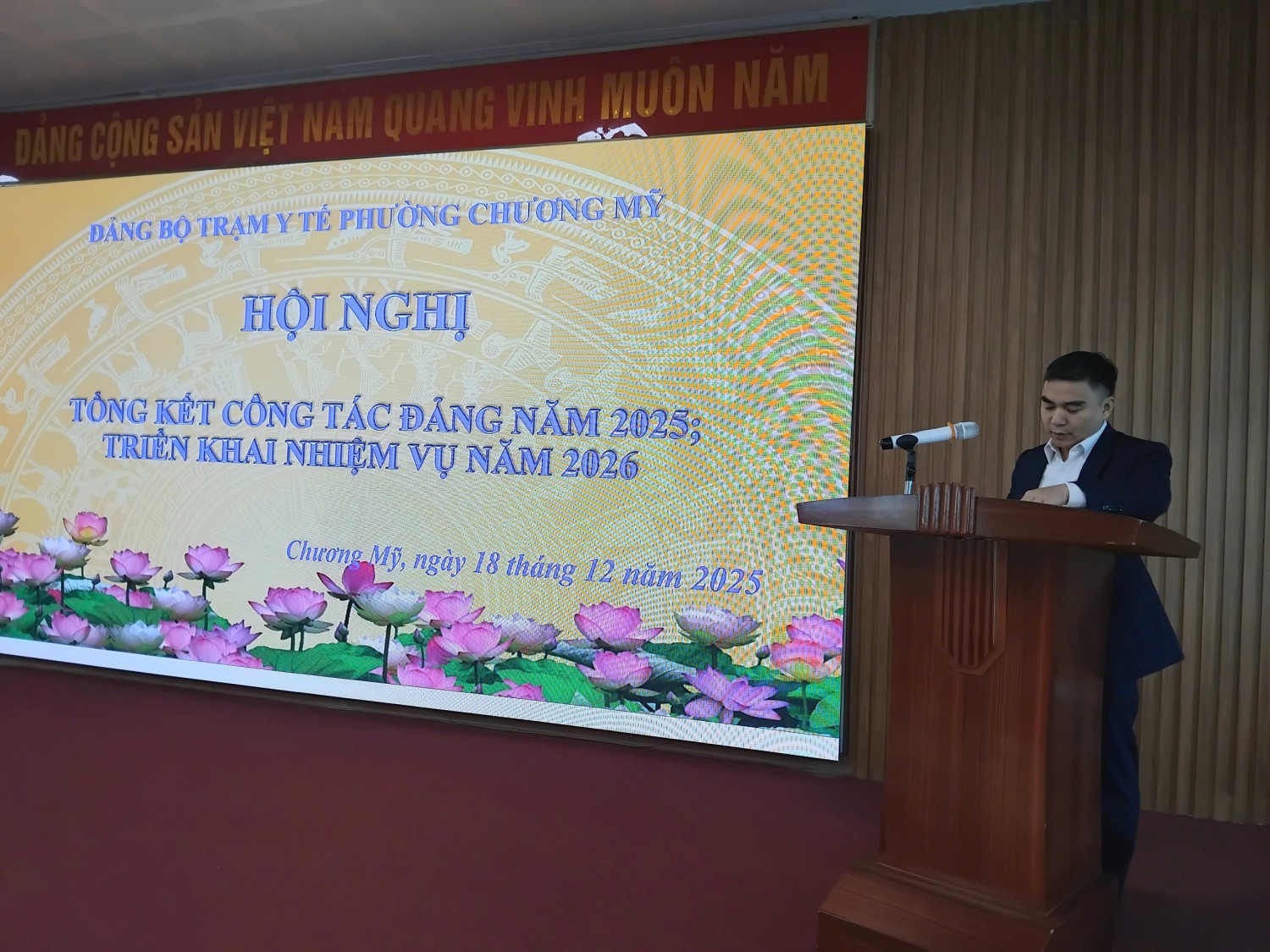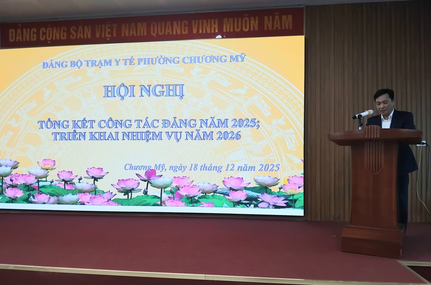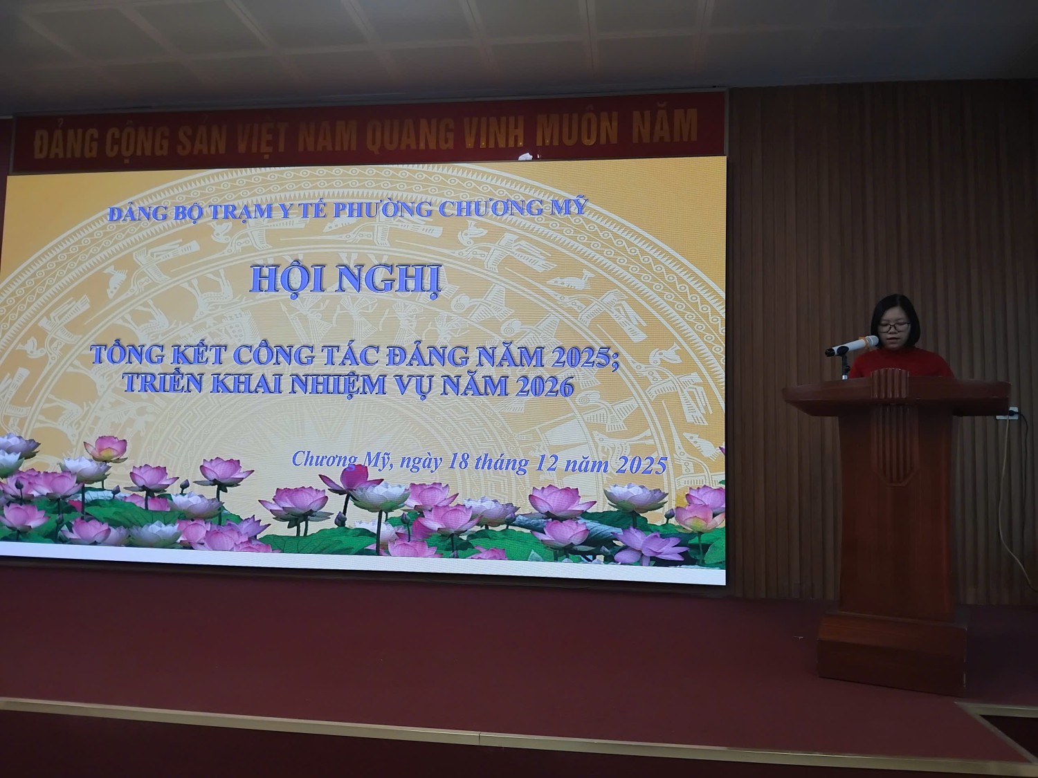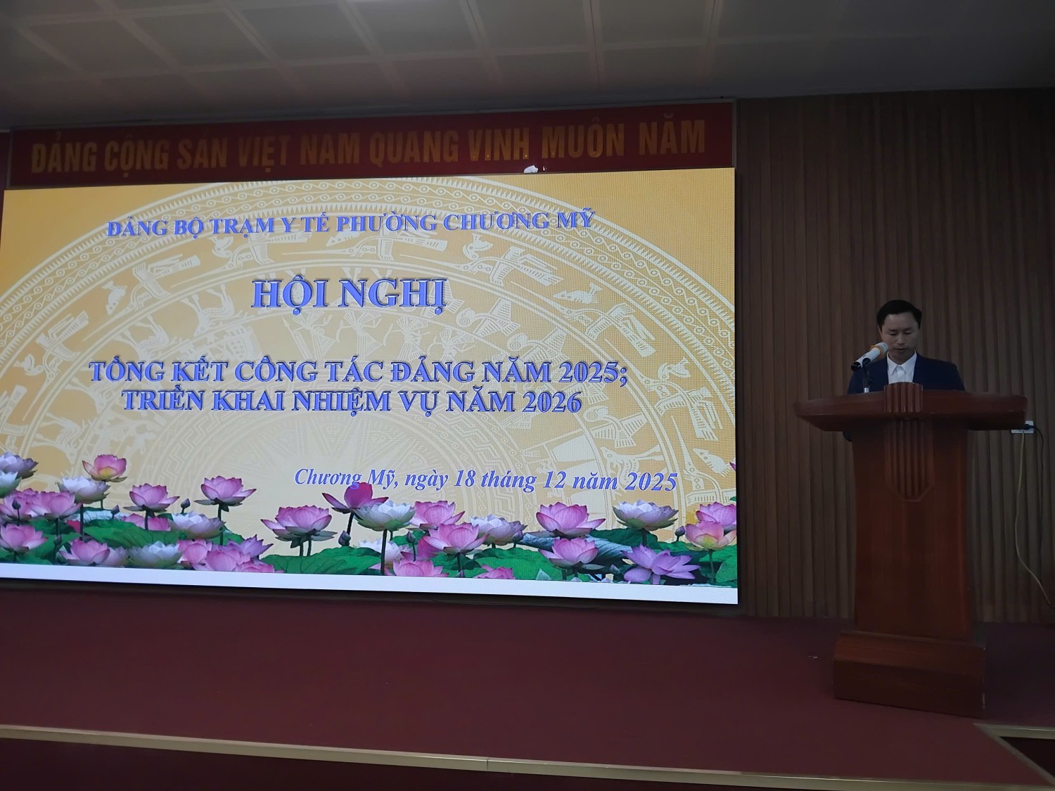 Chiều ngày 18/12/2025, Đảng bộ Trạm Y tế phường Chương Mỹ đã tổ chức Hội nghị tổng kết công tác năm 2025, triển khai nhiệm vụ năm 2026. Hội nghị diễn ra trong không khí nghiêm túc, dân chủ, trách nhiệm, thể hiện quyết tâm cao của tập thể cán bộ, đảng viên trong việc thực hiện tốt nhiệm vụ chính trị được giao. Tham dự hội nghị có đồng chí Dương Mạnh Hùng – Bí thư Đảng ủy Trạm Y tế phường Chương Mỹ, đồng chí Vũ Đình Hải – Phó Bí thư Đảng ủy Trạm Y tế phường, các đồng chí trong Ban Chấp hành Đảng uỷ cùng toàn thể đảng viên của Đảng bộ Trạm Y tế.