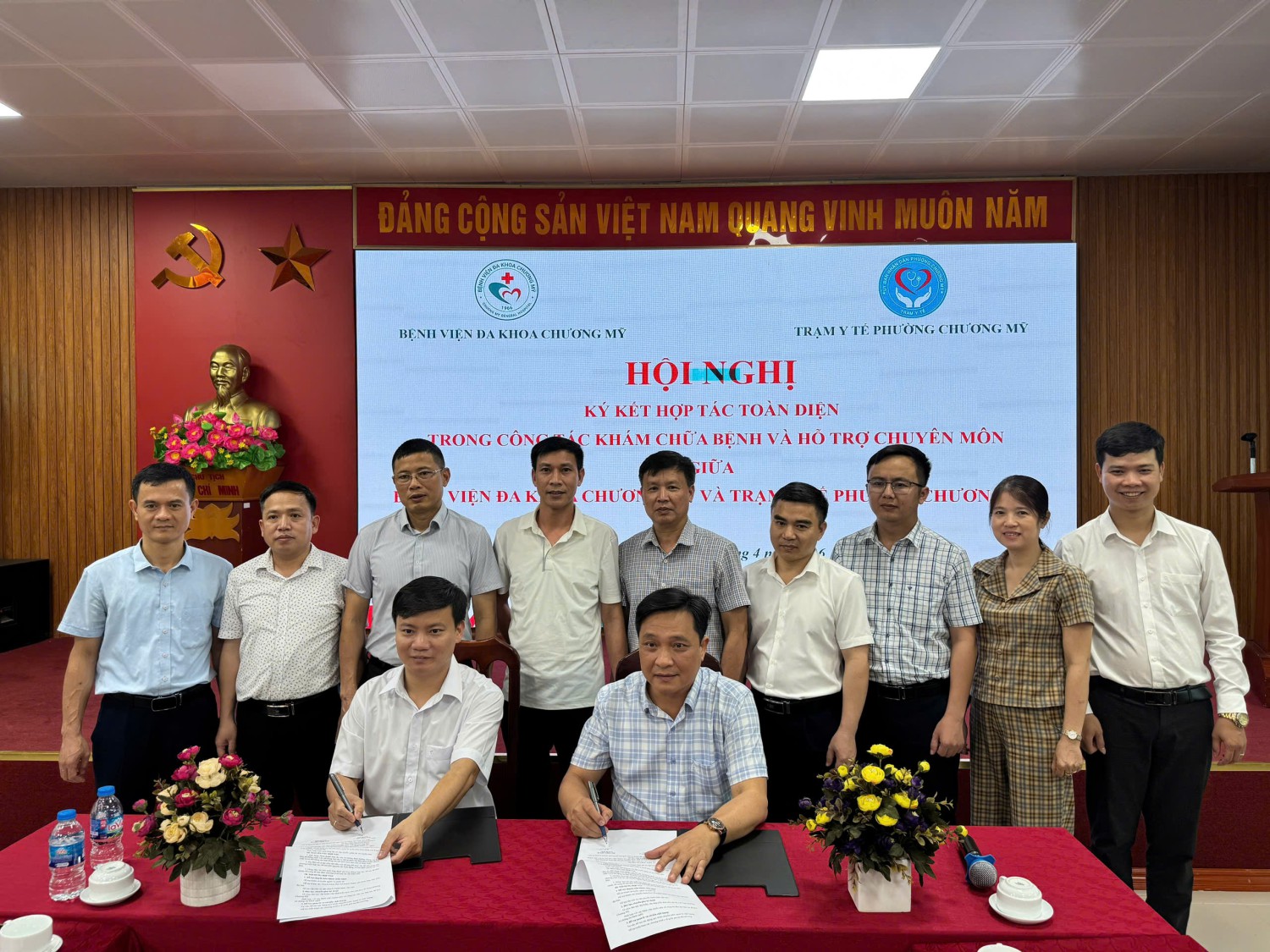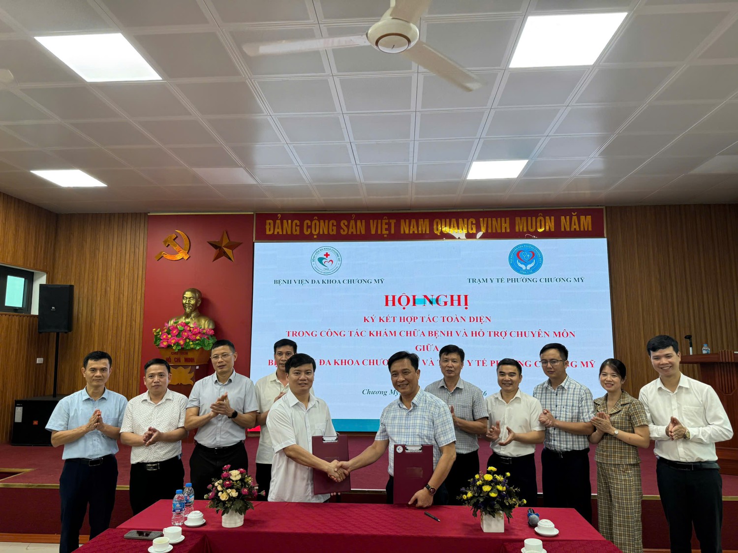 Chiều ngày 06/04/2026, tại Trạm Y tế phường Chương Mỹ đã diễn ra Hội nghị ký kết hợp tác toàn diện trong công tác khám chữa bệnh và hỗ trợ chuyên môn giữa Bệnh viện Đa khoa Chương Mỹ và Trạm Y tế phường Chương Mỹ. Đây là hoạt động có ý nghĩa quan trọng nhằm nâng cao chất lượng chăm sóc sức khỏe ban đầu cho nhân dân trên địa bàn. Hội nghị được tổ chức trên cơ sở triển khai các văn bản chỉ đạo của cấp trên, gồm: Kế hoạch số 147/KH-UBND ngày 27/5/2025 của UBND Thành phố Hà Nội về việc hỗ trợ chuyên môn cho các cấp khám chữa bệnh trên địa bàn thành phố đến năm 2030; Kế hoạch số 2798/KH-SYT ngày 09/6/2025 của Sở Y tế Hà Nội; Kế hoạch số 66/KH-BVCM ngày 12/01/2026 của Bệnh viện Đa khoa Chương Mỹ về công tác chỉ đạo tuyến năm 2026; cùng Công văn số 203/CV-TYT ngày 30/03/2026 của Trạm Y tế phường Chương Mỹ về đề nghị hỗ trợ chuyên môn khám chữa bệnh. Tham dự hội nghị, về phía Bệnh viện Đa khoa Chương Mỹ có BSCKII Trần Xuân Khuyến – Giám đốc Bệnh viện; Ths.TTƯT Trần Quốc Tuấn - Phó Giám đốc bệnh viện cùng các cán bộ chuyên môn. Về phía Trạm Y tế phường Chương Mỹ có Thạc sĩ, Bác sĩ Dương Mạnh Hùng – Giám đốc Trạm Y tế phường; Bác sĩ Vũ Đình Hải - Phó Giám đốc Trạm y tế phường cùng tổ chuyên môn, nhân viên y tế của Trạm Y tế phường.