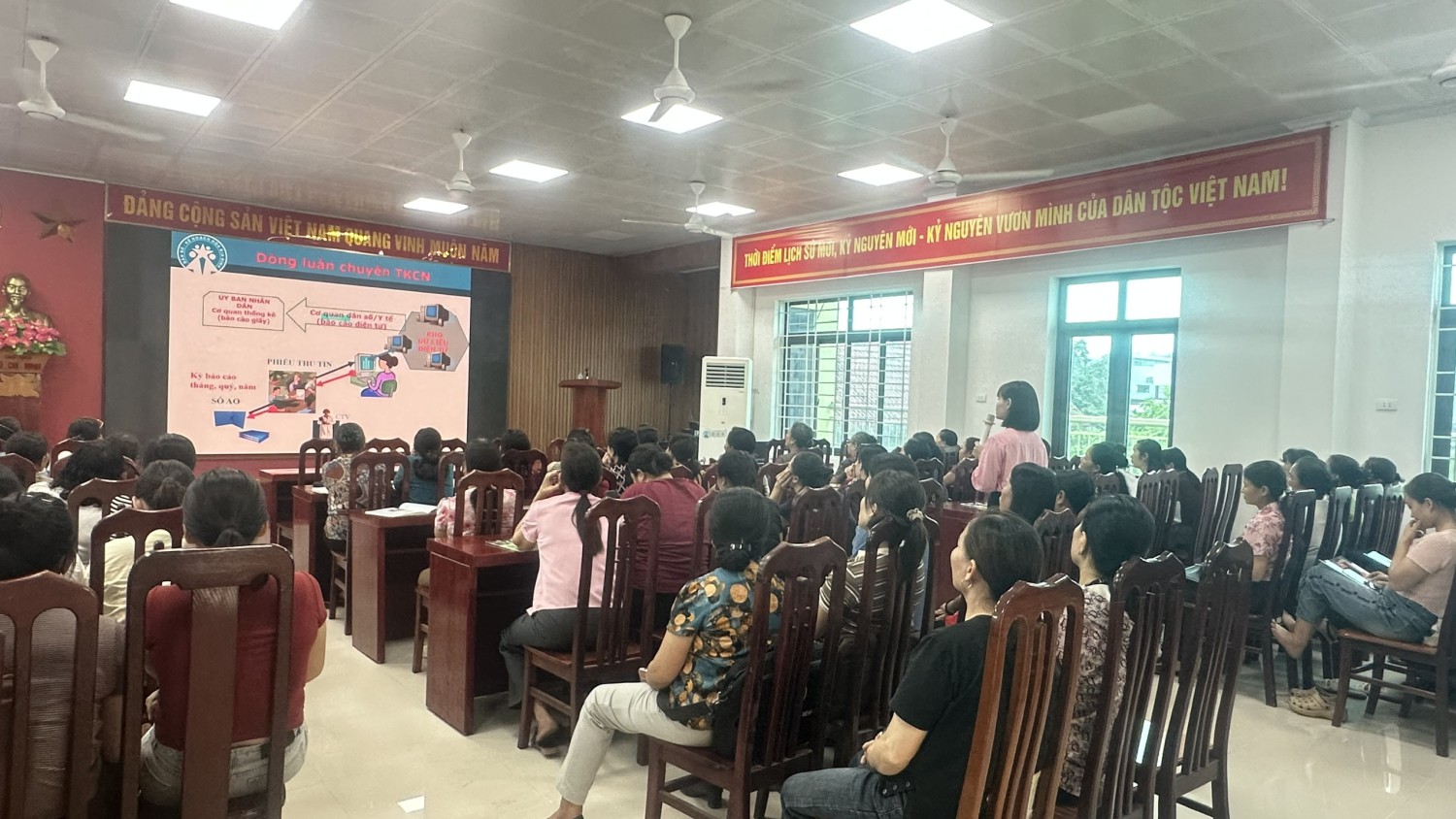 Đồng chí Nguyễn Thị Ngọc Mai – Viên chức Dân số, Tổ Dân số, Trẻ em và Bảo trợ xã hội, Trạm Y tế phường Chương Mỹ truyền đạt các nội dung của buổi tập huấn